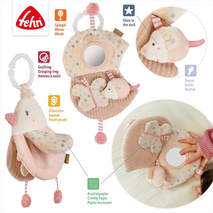 The Bird Soft Book from the Fehnland collection is a charming sensory book designed in the shape of a sweet little bird. With four soft pages, gentle colours and interactive elements, it invites babies from birth to explore, touch and discover. Hidden beneath the bird’s wings are two little friends – a rattle mouse and a crinkly butterfly – along with a baby-safe mirror that delights and encourages curiosity.