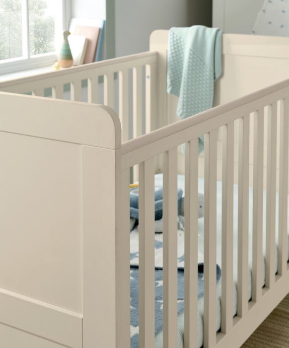 Hampden Baby Cot Bed – Cashmere The cot has three adjustable height positions and can convert into a toddler bed, meaning it will last for the first four years of your child’s life. Crafted with the utmost care and using durable materials, it is designed to withstand the rigors of daily use and the active nature of growing children. And with the addition of a double wardrobe and convertible dresser/changer, you’ll have plenty of storage space for all of your baby’s essentials.