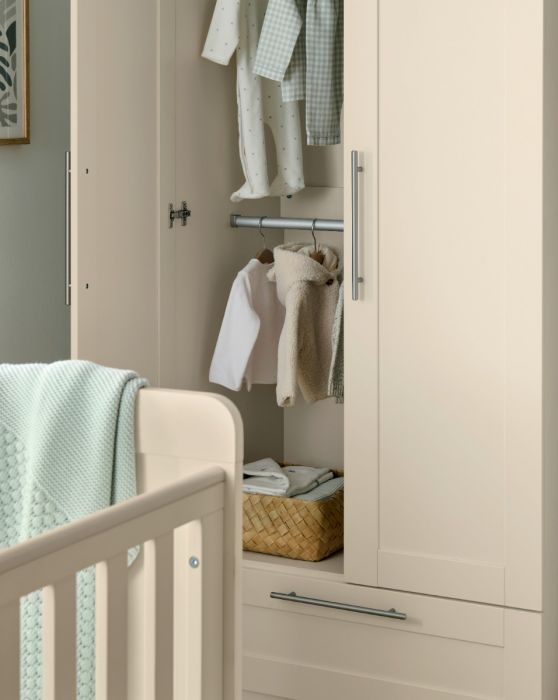 The double wardrobe in the soft white finish from the Hampden nursery furniture collection will look stunning in any nursery, as well as providing a significant amount of nursery storage space. Featuring double doors, a removable rail and full sized drawer storing baby’s favourite outfits has never been simpler.