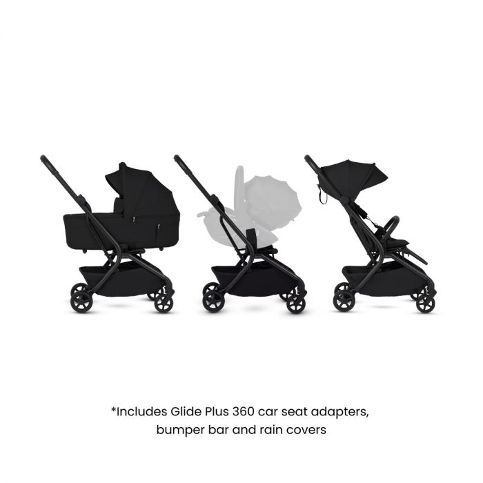 Finished in sleek Onyx with crease-free, breathable fabrics and cushioned vegan leather details, Nia looks as good as it performs. And when you need to switch from strolling to driving, you’re ready-Glide compatibility with 360 adaptors included.